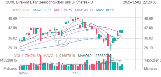 Semiconductor ETF $Direxion Daily Semiconductors Bull 3x Shares(SOXL)$ closed at $41.31 on December 2nd, up +0.12% (+$0.05), trading within a $39.46-$42.36 range. The ETF remains 18.6% below its 52-week high of $50.76, showing recovery potential from October lows.