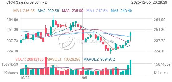 CRM closed at $247.46 EST Dec 5th, gaining +$8.74 (+3.66%) with impressive volume of 20.91M shares.