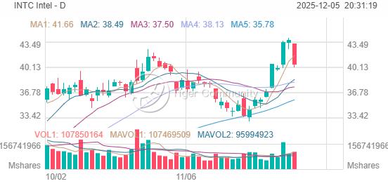 Intel closed at $40.50 on December 5th (EST), down -7.45% (-$3.26) from previous close of $43.76.