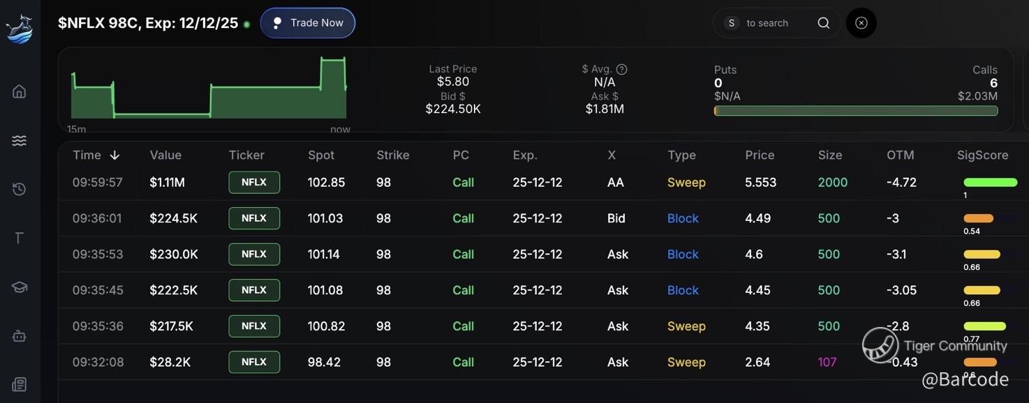 I called this the easiest lotto-style setup available. Not because I took the trade, because the flow screamed conviction. More than $2M in aggressive ITM call sweeps: $98 strike; expiry 12 Dec 25; single 2000 contract print at $5.553; multiple 500-lot hits $4.35 to $4.60. That is smart money positioning before retail processed the story.