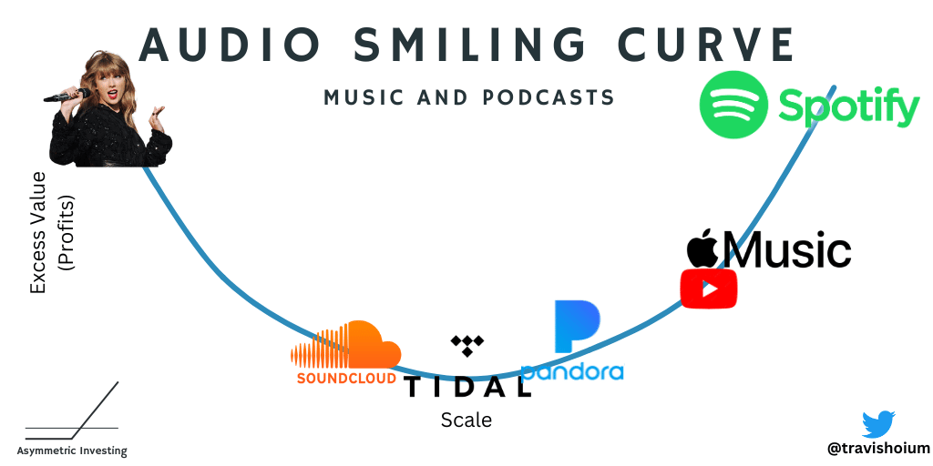 Take music as an example. Why is Spotify a massive company with rapidly improving cash flows, and Tidal, Pandora, and Soundcloud are fading into irrelevance? Because Spotify has more scale!