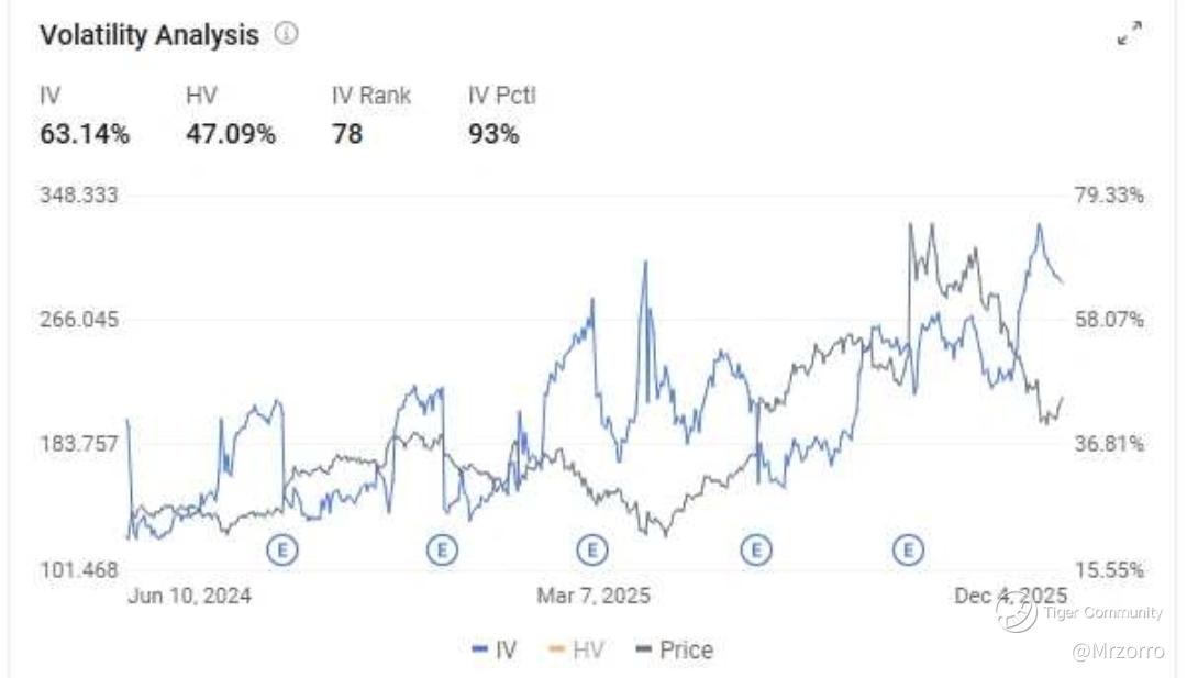 – Implied volatility: about 63.14%, sitting near the 93rd percentile of its historical range.
