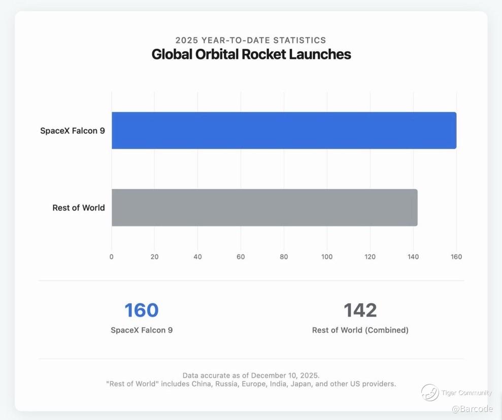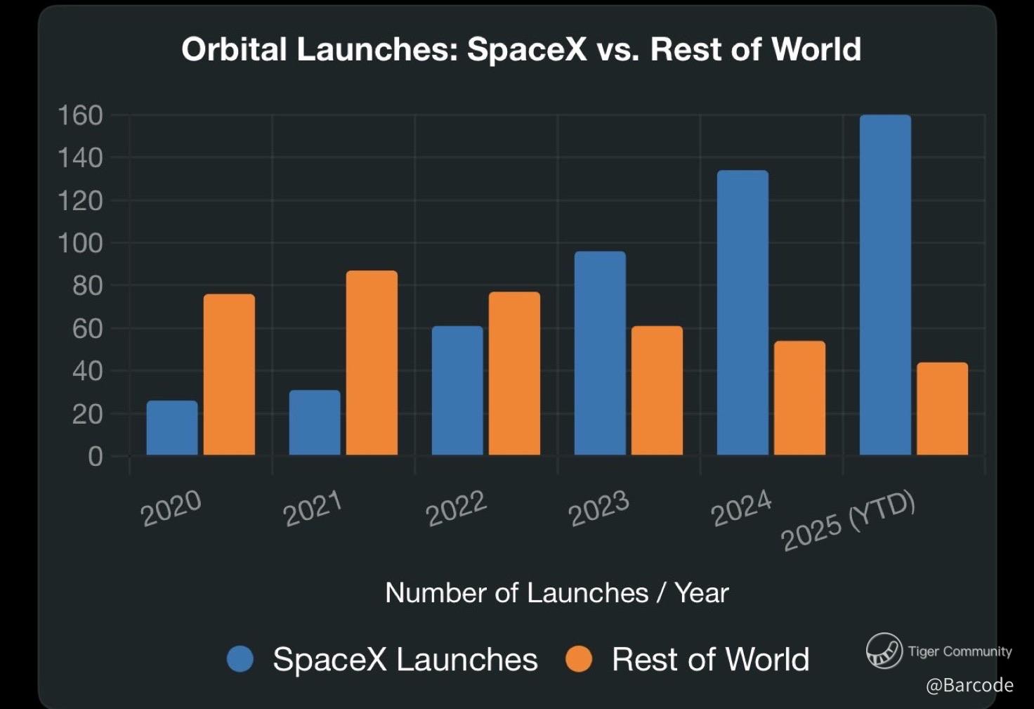 SpaceX reached 160 orbital launches this year. The entire rest of the world including China, Russia, Europe, India, Japan, and other US providers combined sits around 142. Falcon 9 carries roughly 53% to 60% of all orbital missions, depending on the metric, and SpaceX alone often accounts for more than 60% of successful mass insertion to orbit in a year.