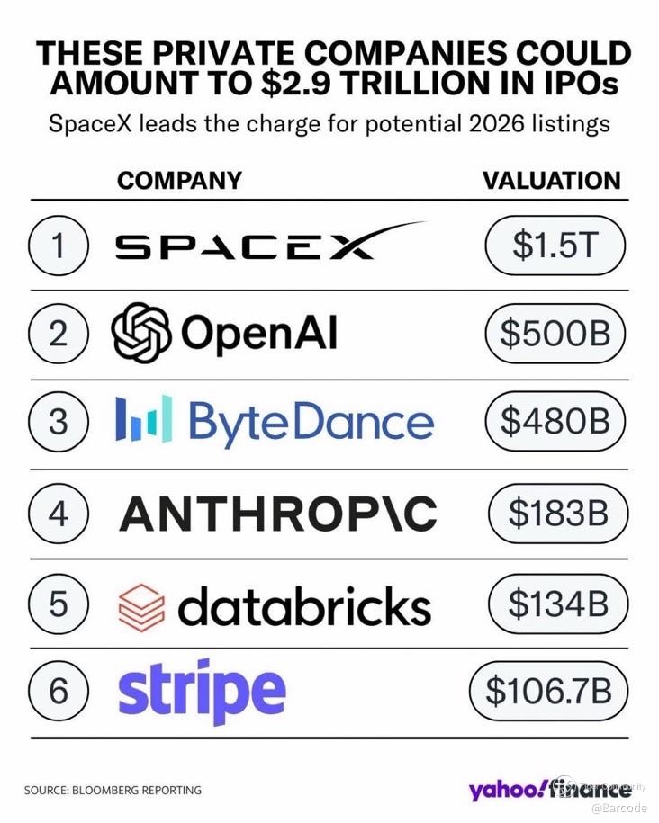 Bloomberg and private trackers show SpaceX as the crown jewel of a roughly $2.9T IPO pipeline: