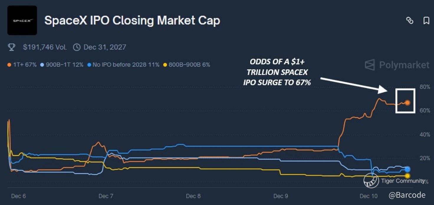 I am convinced SpaceX is setting up one of the most asymmetric listings in modern market history. Elon Musk owns 42%, Founders Fund holds 10.4%, Google Ventures owns 7.4%, and the remaining 30% sits with strategic investors. If SpaceX IPOs at a $1.5T valuation, his stake alone is worth roughly $625B, lifting his net worth towards about $952B. There is currently around a 67% probability on Polymarket that SpaceX’s closing market cap exceeds $1T, while earlier contracts traded closer to 54%. Secondary tenders have already drifted toward $400B this year as investors price in a structural rerating, not just hype.