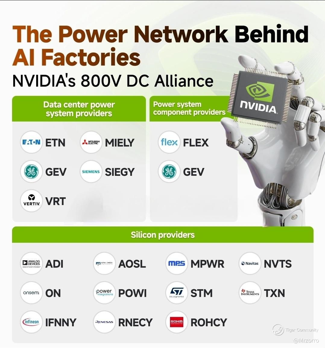 $NVIDIA (NVDA.US)$ took the stage at the Open Compute Project conference to spotlight its 800V DC alliance, a coalition stretching from chipmakers to switchgear giants. Nvidia's 800V DC power system and component partners include companies such as $GE Vernova (GEV.US)$ , $Eaton (ETN.US)$ , $SIEMENS AG (SIEGY.US)$ , $Mitsubishi Electric (ADR) (MIELY.US)$ , $Vertiv Holdings (VRT.US)$ , and $Flex Ltd (FLEX.US)$ . The proposition is straightforward: by moving power distribution to 800V DC, data centers can cut copper losses, streamline power conversion stages, and ultimately boost rack density.