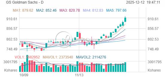 GS closed at $911.03 on December 12, 2025, gaining +2.45% (+$21.79) and hitting a new 52-week high of $919.10.