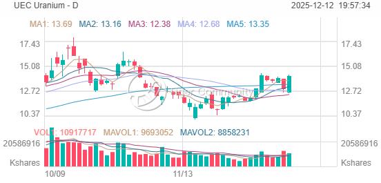 UEC closed at $14.15 on December 12th, surging +9.52% ($+1.23) from previous close of $12.92.