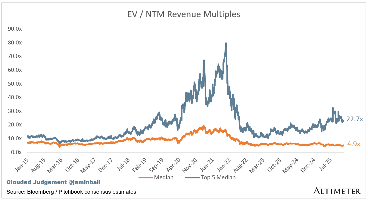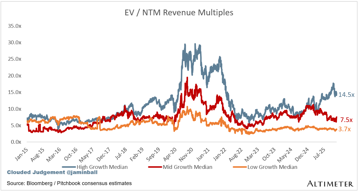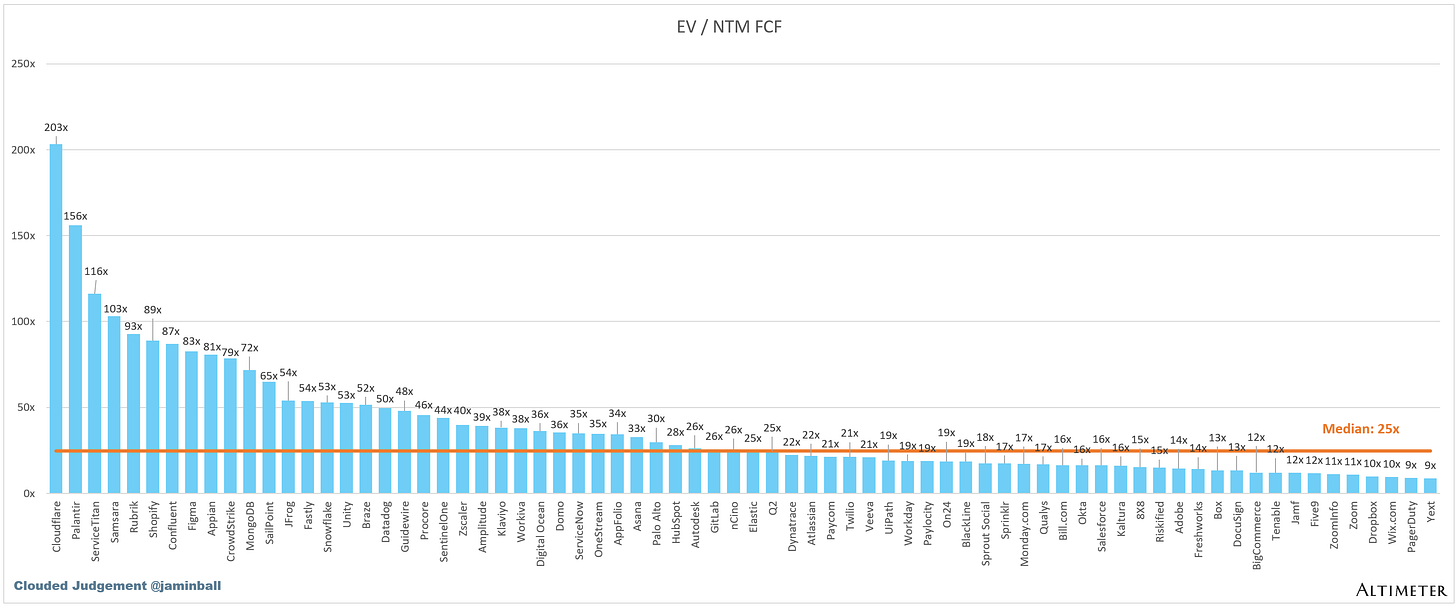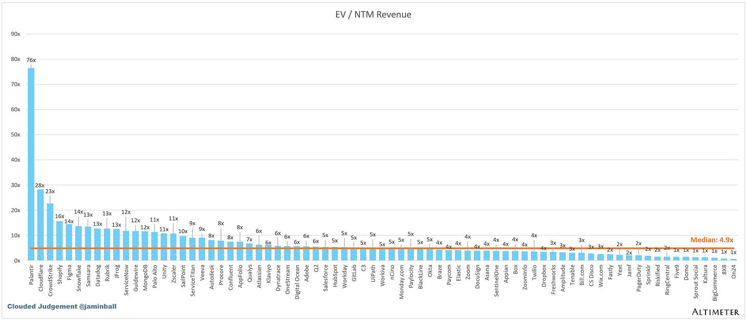 SaaS businesses are generally valued on a multiple of their revenue - in most cases the projected revenue for the next 12 months. Revenue multiples are a shorthand valuation framework. Given most software companies are not profitable, or not generating meaningful FCF, it’s the only metric to compare the entire industry against. Even a DCF is riddled with long term assumptions. The promise of SaaS is that growth in the early years leads to profits in the mature years. Multiples shown below are calculated by taking the Enterprise Value (market cap + debt - cash) / NTM revenue.