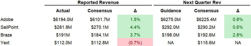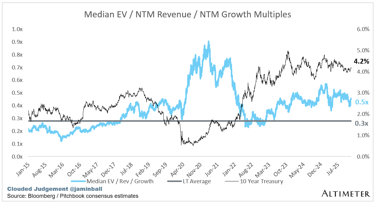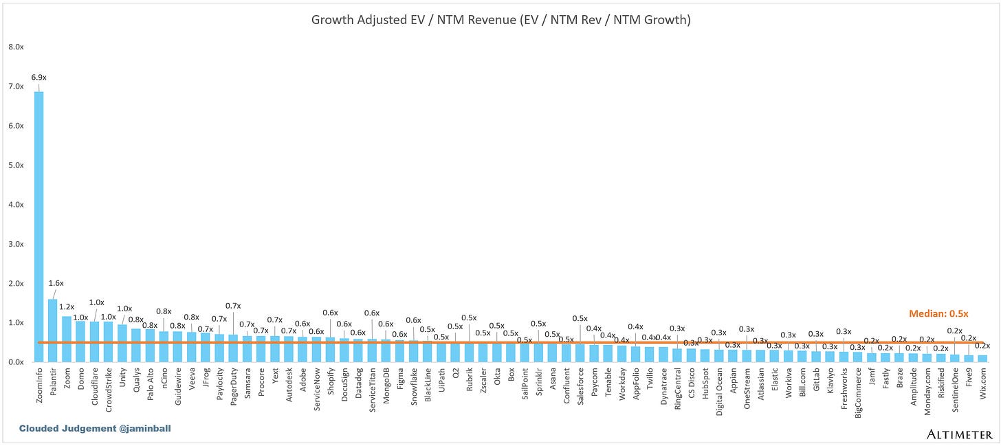 The below chart shows the EV / NTM revenue multiple divided by NTM consensus growth expectations. So a company trading at 20x NTM revenue that is projected to grow 100% would be trading at 0.2x. The goal of this graph is to show how relatively cheap / expensive each stock is relative to its growth expectations.