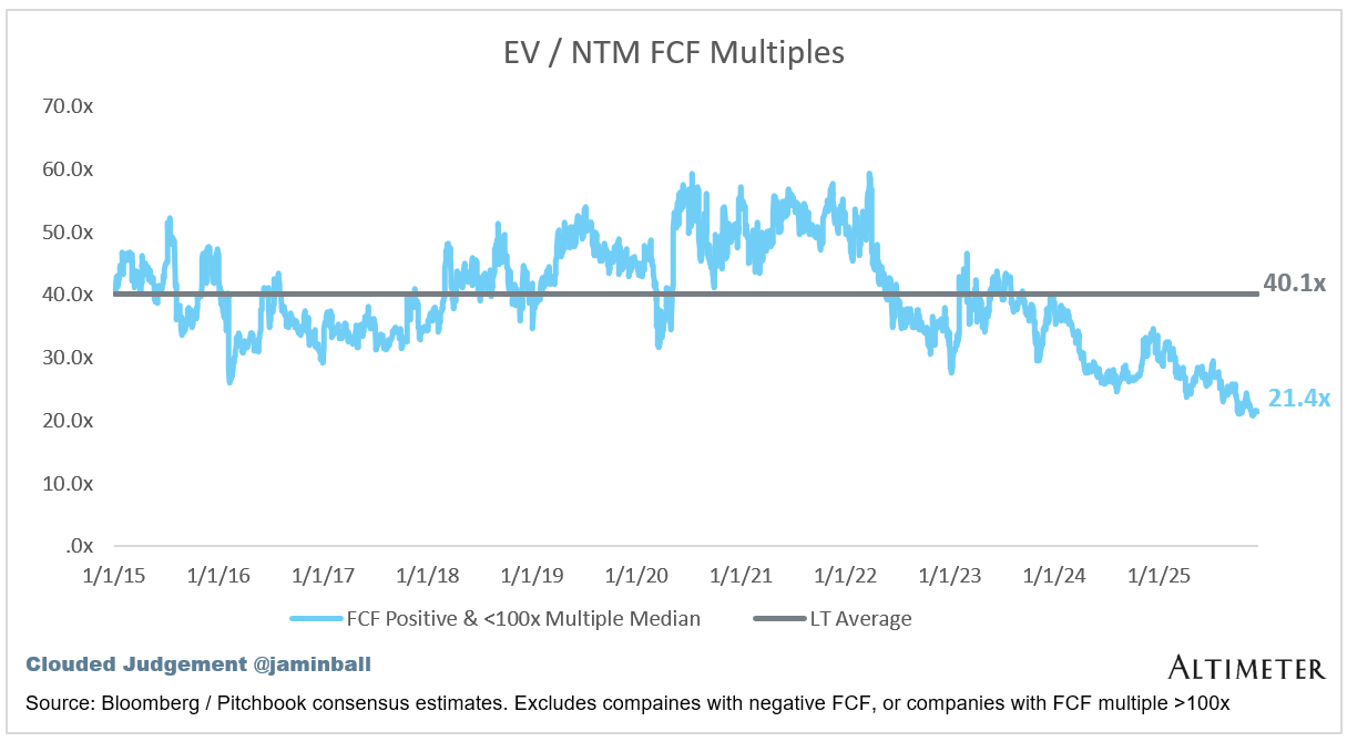 The line chart shows the median of all companies with a FCF multiple >0x and <100x. I created this subset to show companies where FCF is a relevant valuation metric.