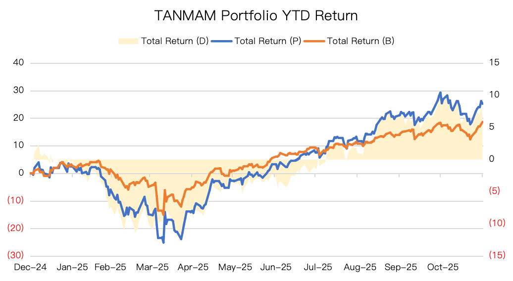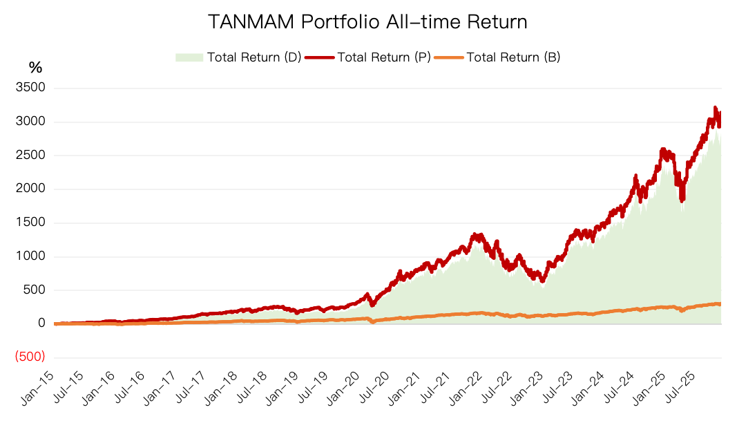 An equal-weighted portfolio of the Magnificent Seven (“TANMAMG”), rebalanced quarterly, has significantly outperformed the S&P 500 since 2015. Total return reached 3,112.63%, versus 303.16% for SPY—an excess return of 2,809.47%, while still operating at elevated valuation levels.