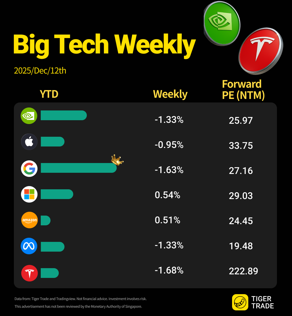 Big Tech saw heavy selling on Friday. As of the Dec 4 close, more than half of the large-cap tech names were down over the past week, with Nvidia and $Alphabet(GOOG)$ both falling around 4% by Friday’s close.