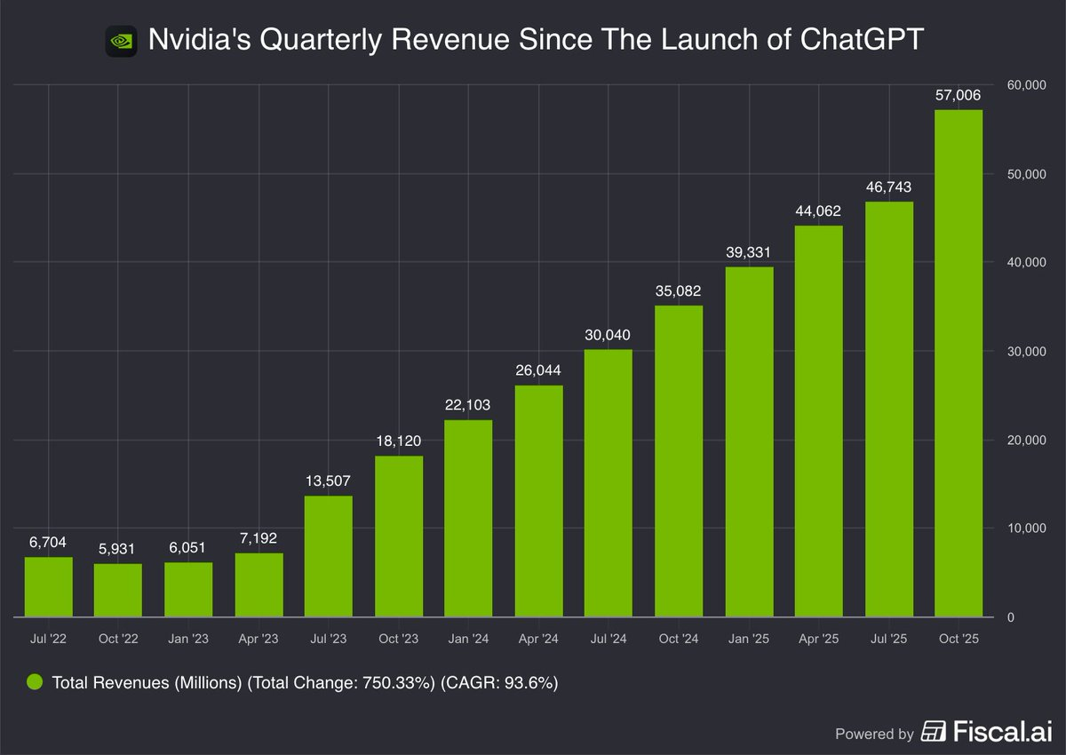 Since the launch of ChatGPT, Nvidia’s quarterly revenue has accelerated sharply—from $5.9bn in 3Q22 to $57bn in 3Q25, nearly a tenfold increase in three years. Spillover demand effects from large-scale AI training and inference continue to strengthen.