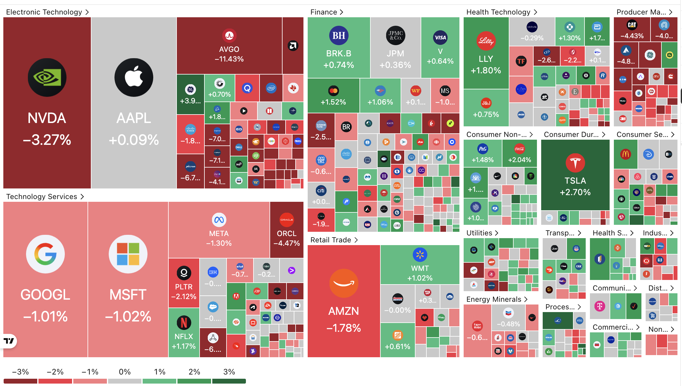 $Oracle(ORCL)$,繼前一天暴跌10%後,再跌4%,因市場擔心其爲OpenAI開展的數據中心項目可能推遲至2028年。$博通(AVGO)$盈利超出預期,但高管關於利潤率疲軟的言論導致該股下跌11%。