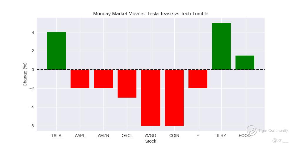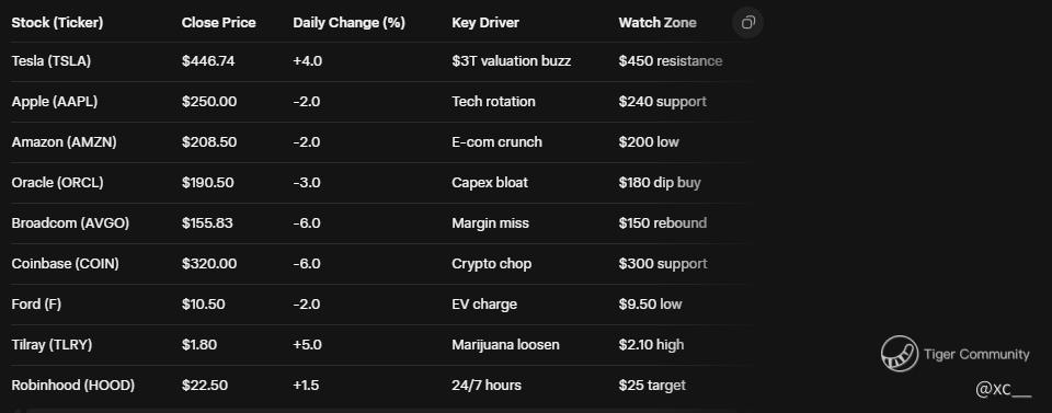 Stocks to watch: Tesla (TSLA) for $450 resistance break on Optimus buzz, Nvidia (NVDA) on open-source AI plays, Ford (F) for EV charge fallout, Broadcom (AVGO) rebound from margin miss, Coinbase (COIN) amid crypto chop, Apple (AAPL) consumer pulse, Amazon (AMZN) e-com edge, Oracle (ORCL) AI infra test, Robinhood (HOOD) on 24/7 trading hype, Tilray (TLRY) for pot policy pops.
