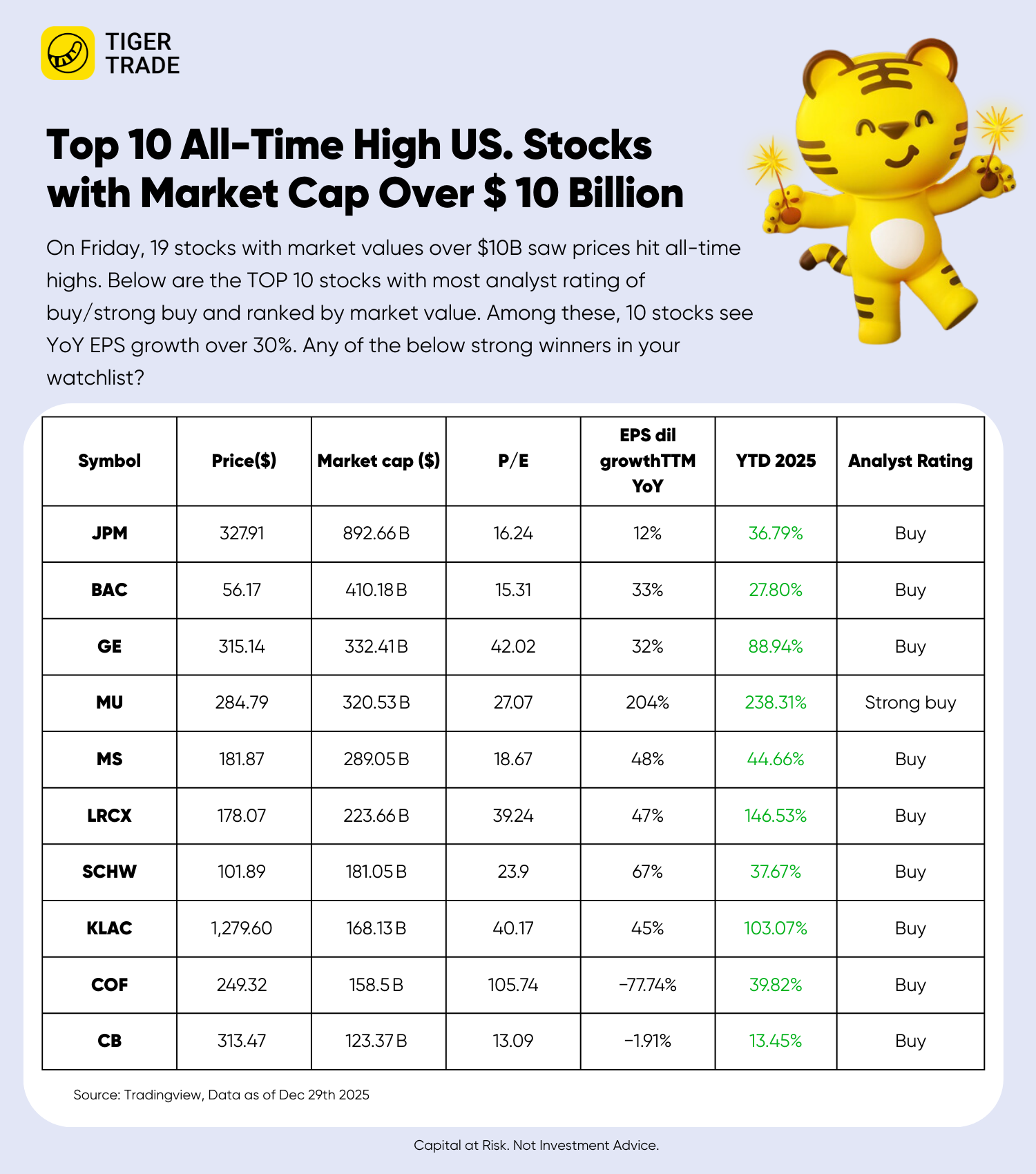 According to TradingView, on Monday, there were 19 stocks with market value over $10B that saw prices hit all time high. Below are the TOP 10 stocks with analyst rating of buy and ranked by market value: $JPMorgan Chase(JPM)$ $Bank of America(BAC)$ $GE Aerospace(GE)$ $Micron Technology(MU)$ $Morgan Stanley(MS)$ $Lam Research(LRCX)$ $Charles Schwab(SCHW)$ $KLA-Tencor(KLAC)$ $Capital One(COF)$ $Chubb(CB)$