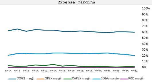 Over the last decade, BMI's expense margins have remained relatively stable. I personally like it when a company's expense margins come down over time. If the cost-of-goods (COGS) margin is coming down, then this suggests that the company has pricing power, as it indicates a growing markup is being charged. If the operating expenses (OpEx) margin is coming down, then this suggests that the company has operating efficiency, as the cost of operations aren't going up as revenue goes up. BMI's growth hasn't come from expense margins significantly coming down. This suggests that growth is primarily volume growth, not price growth.