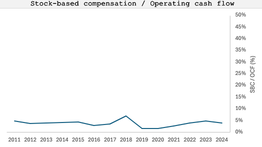 If I were to become a shareholder in BMI, I would want to know first whether they would be good stewards of my capital. I would want to avoid management that substantially dilutes shareholder interests in the company through share-based compensation (SBC). BMI uses less than 5% of their operating cash flow (OCF) as SBC. This is very low, particularly compared to some tech companies where the ratio often reaches over 30%. So SBC isn’t an issue.