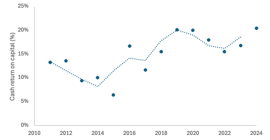 Having seen that BMI primarily finances itself through shareholder equity (with a small amount of low cost debt), we can now turn to the returns BMI generates from its capital. The below chart shows the cash return on capital over the last 15 years. Since 2018, their cash ROC has typically been above 15% and is currently approximately 20%. This means they obtain a 20% return in cash from every $100 of capital they invest. While this is significantly above average, I would ideally like to see a higher figure here. For comparison, the weighted cash ROC of my portfolio is currently 40%.