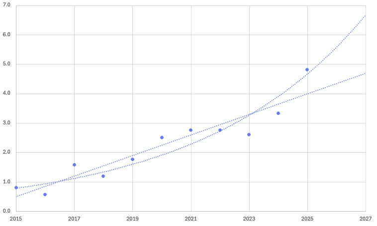 The below chart is BMI's FCF per share over the last decade. My forecast is that in 2027 the FCF per share will be $5.2. At today's share price of $180.75, this equates to a forward FCF yield of 2.8%, which is a lot lower than other companies I follow. For example, my forward FCF yield calculation for Qualys is 5.7%.