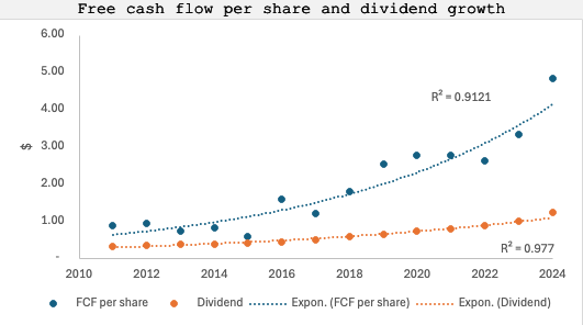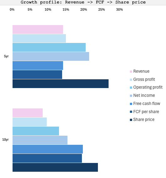 While this is good, their growth isn't as high as I would personally look for. For reference, the companies in my portfolio typically average over 25% FCF per share growth per year.