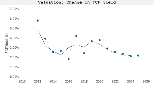 The below chart shows that BMI's FCF yield has gradually dropped from 3.82% in 2019 to 2.22% today. Again, this highlights that share price growth has - in part - been driven by a market re-rating of the share price.