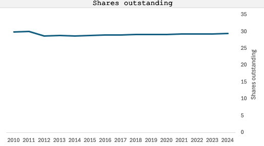 To combat the shareholder dilution caused by SBC, companies often employ buybacks. The below chart shows BMI's shares outstanding over the last 15 years. For the most part, things are quite flat, suggesting that there is neither shareholder dilution (through SBC) nor shareholder concentration (through buybacks). I always avoid substantial dilution, and ideally would like to see the number of outstanding shares go down over time, but it's not the end of the world that I don't.