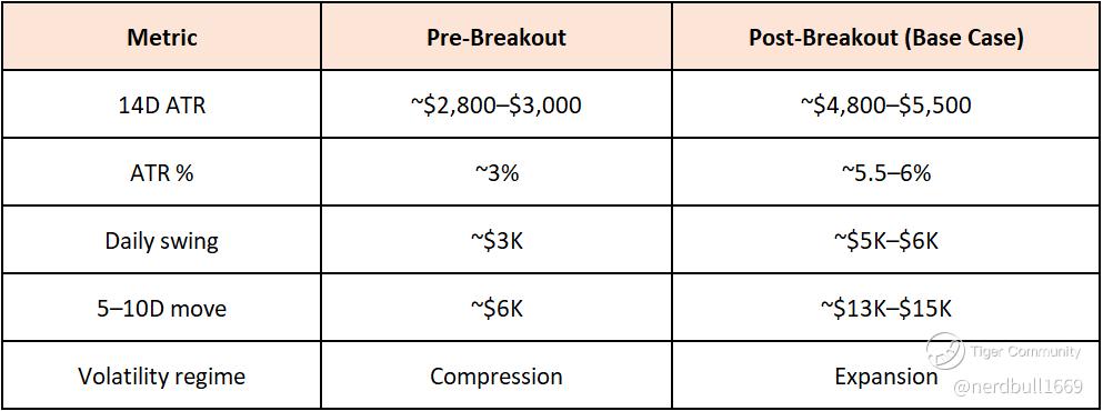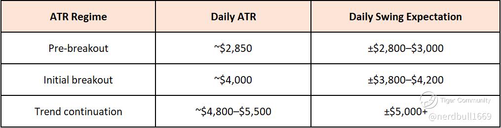 In the following section, we would like to share a quantified ATR-based framework that can be used to estimate post-breakout volatility expansion for Bitcoin, grounded in historical compression → expansion transitions in bullish regimes.