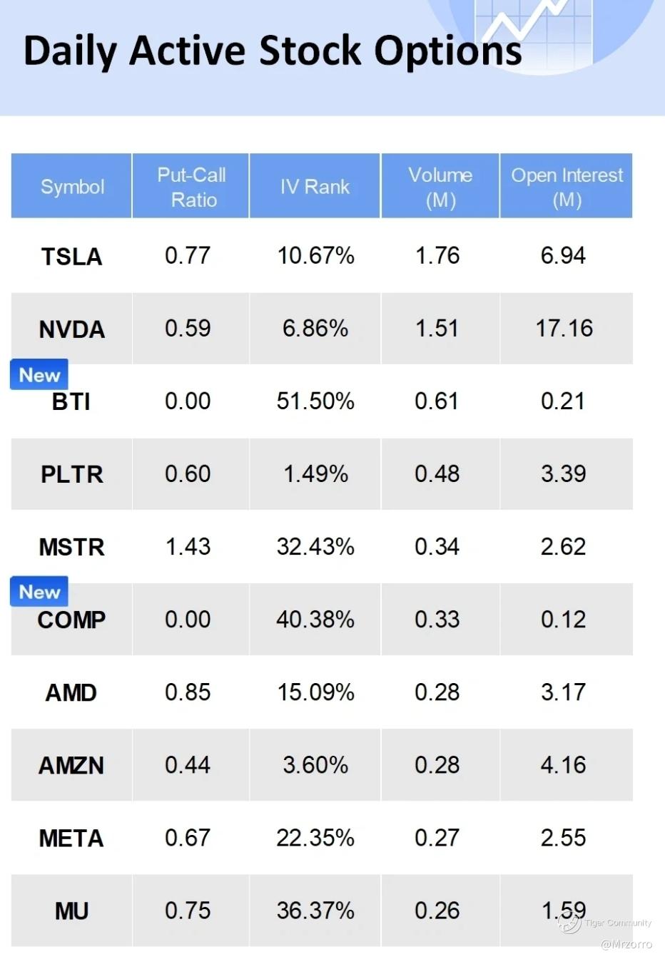 $NVIDIA(NVDA)$ ranked second with a neutral put/call ratio of 0.59 and a low IV rank of 6.86%, suggesting subdued volatility bets as volume reached 1.51 million contracts versus 17.16 million in open interest. Shares slipped 1.2% in a quiet session, coinciding with the company's confirmation that it finalized a $5 billion equity investment in Intel per a prior agreement.