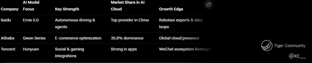Zooming out to China's AI showdown: Alibaba, Tencent, or Baidu—who nails the flywheel first? Alibaba's crushing it in cloud market share at over 35%, pumping billions into Qwen models and e-commerce AI that optimizes everything from logistics to personalized shopping. Tencent's Hunyuan leverages WeChat's social empire for seamless integrations in gaming and finance, but it's playing catch-up on pure infra scale. Baidu? It's surging ahead with enterprise-focused optimization engines like Famou, which crunch real-time data for traffic and energy grids—practical, actionable AI that's already in control loops, not just chatbots. Experts bet Baidu edges out thanks to its autonomous driving data goldmine, potentially closing the loop faster in physical world apps. 🏆