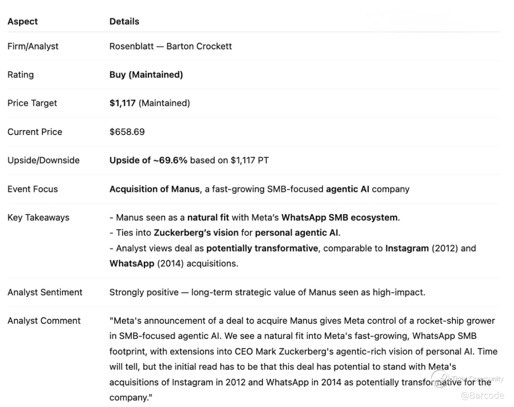 Rosenblatt reiterating a Buy rating and maintaining a $1,117 price target adds institutional validation. With price around $658.69, that implies roughly 69.6% upside, but the framing matters more than the maths. The analyst explicitly compares this deal to Meta’s Instagram 2012 and WhatsApp 2014 acquisitions. Those were not obvious trades at the time. They became compounding engines once fully integrated into the ecosystem.