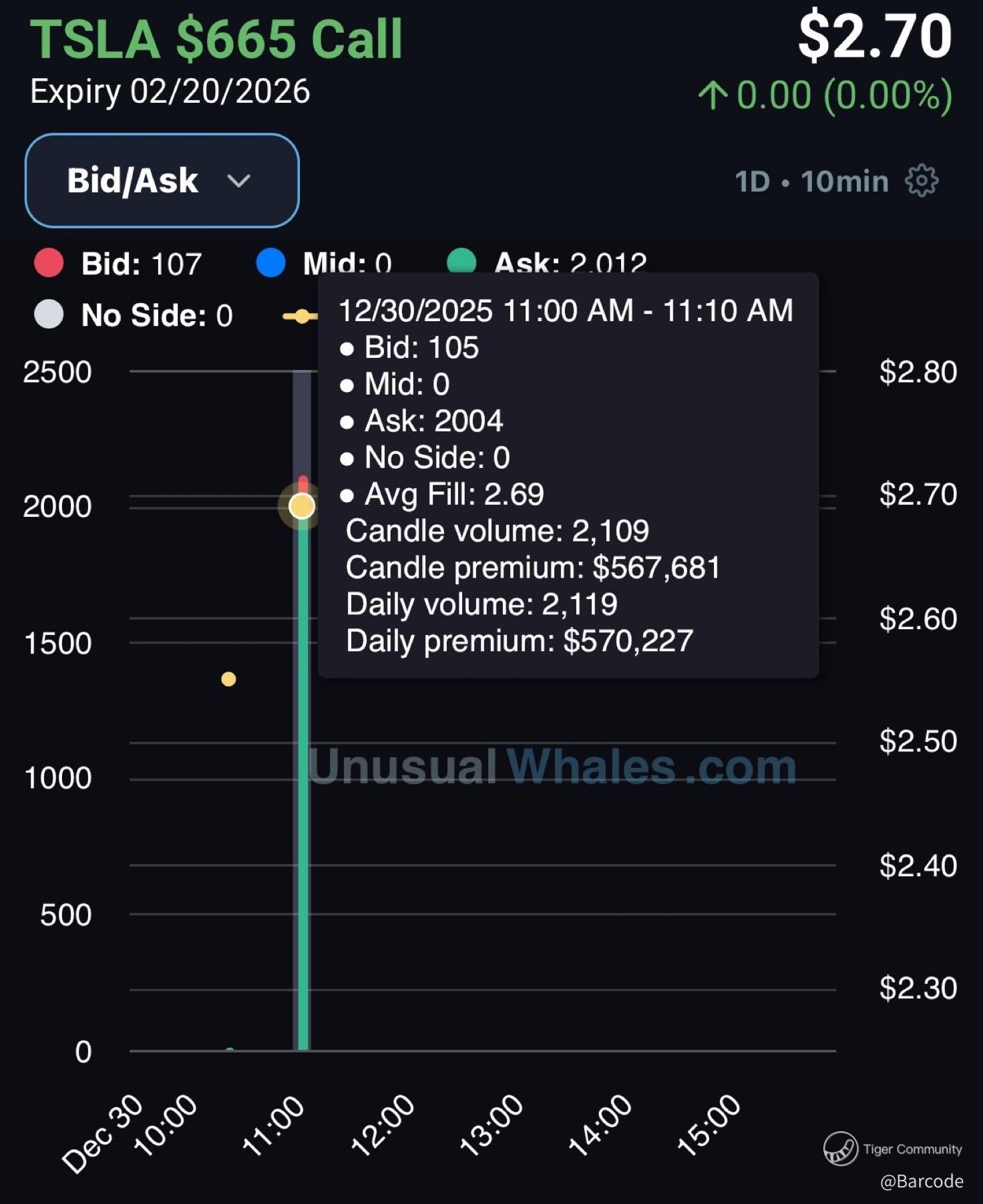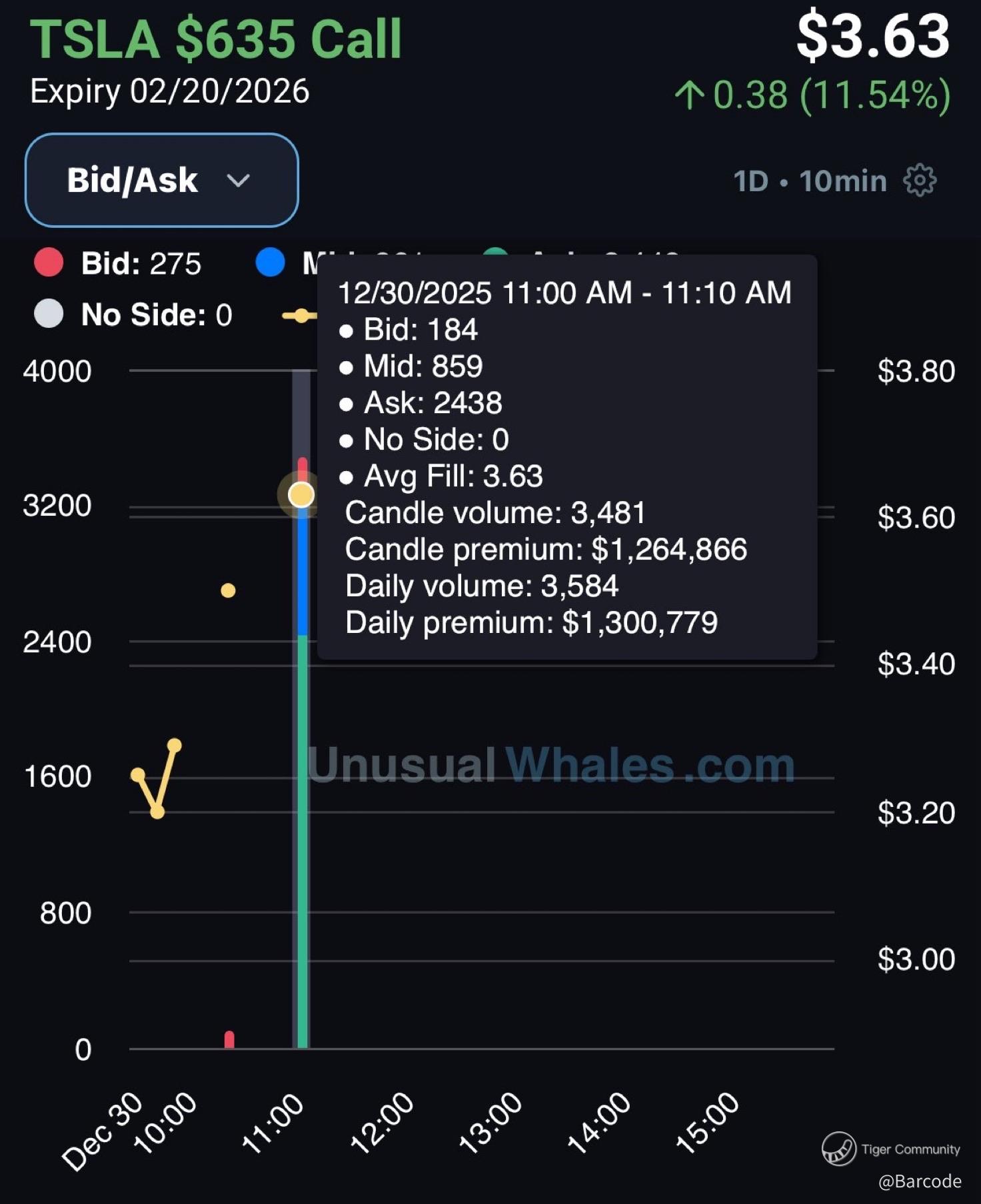 $TSLA flow is even more telling. Feb 20 2026 $635 and $665 calls saw concentrated volume bursts around 11:00am, with single candles printing $567K to $1.26M in premium. Average fills clustered near the ask, not mid. That tells you buyers were willing to pay for time and convexity, not scalp gamma.