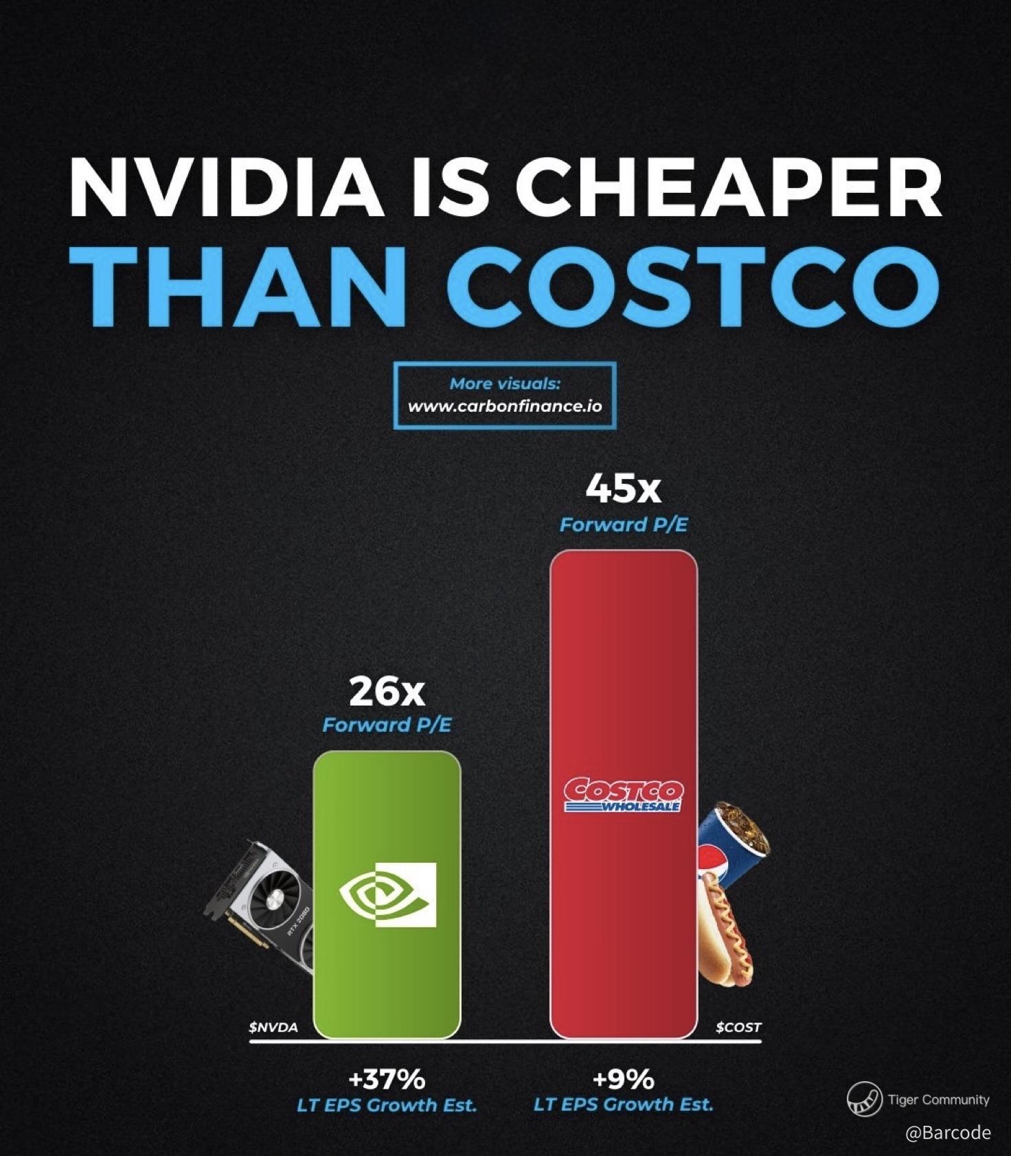 Nvidia trades around the mid-20s forward P/E versus Costco in the low-40s. Yet long-term EPS growth expectations sit near +37% for NVDA versus +9% for COST. Growth is being priced at a discount. That asymmetry rarely persists once flow, structure, and fundamentals align.