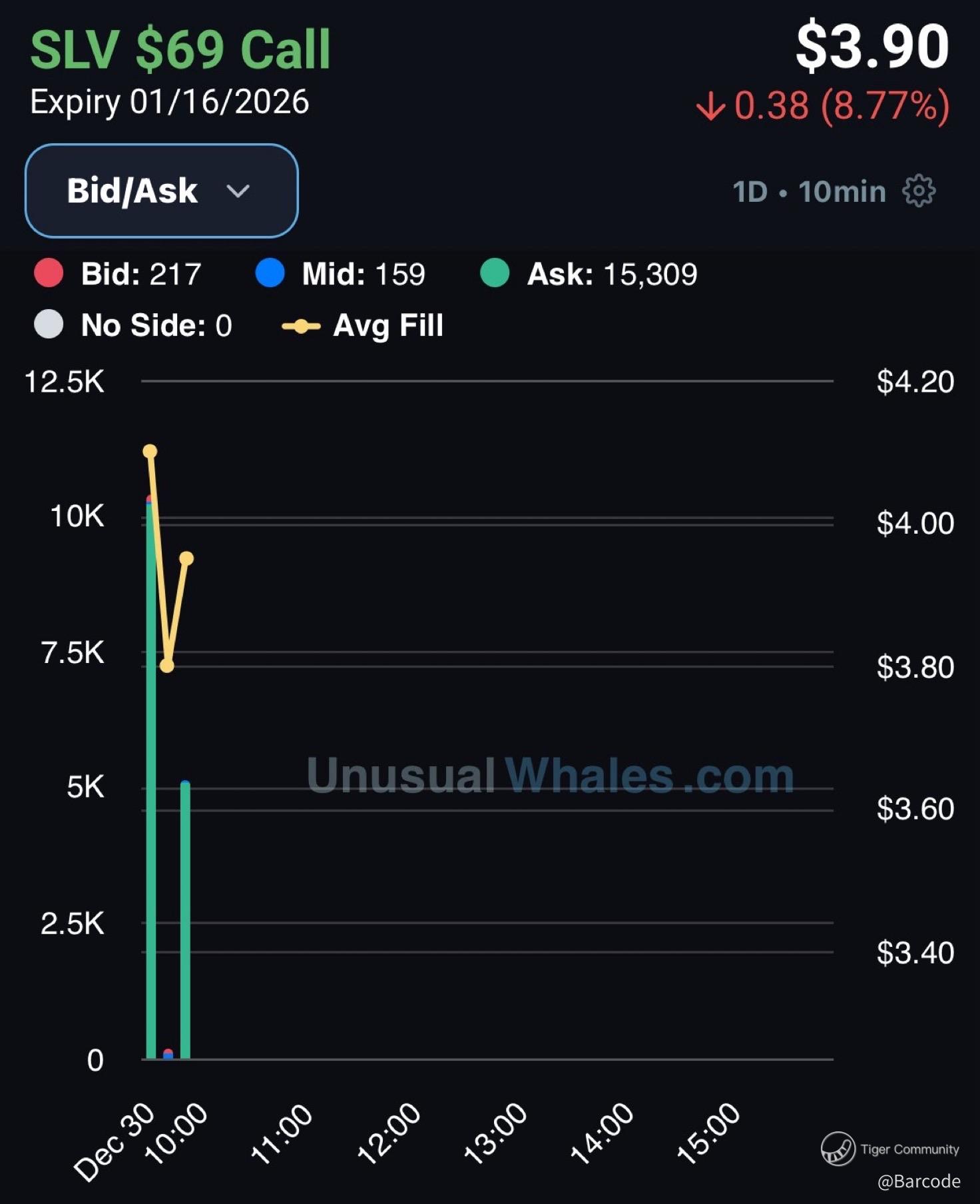 On $SLV, the Jan 16 2026 $69 calls show heavy ask-side execution with large size transacting despite an intraday pullback. Premium held near $3.90 even as price faded, signalling conviction through volatility rather than panic exits. This is classic longer-term exposure being built into weakness, not chased strength.
