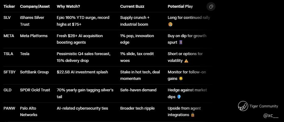 Bullish Bets: Go long on precious metals via ETFs like SLV or miners (e.g., PAAS for leverage) β that 160% momentum could stretch into 2026 with tariff-driven demand. Meta's AI grab opens doors for call options if shares build on the 1% bump, especially with metaverse and ad revs in play. If you're bold, dip-buy Tesla post-forecast if it oversells β contrarian win?