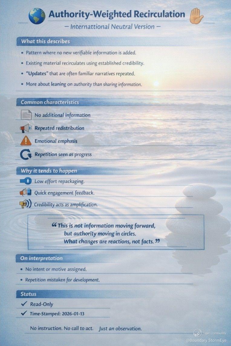 - Authority-weighted recirculation refers to a pattern where no new verifiable information is added,