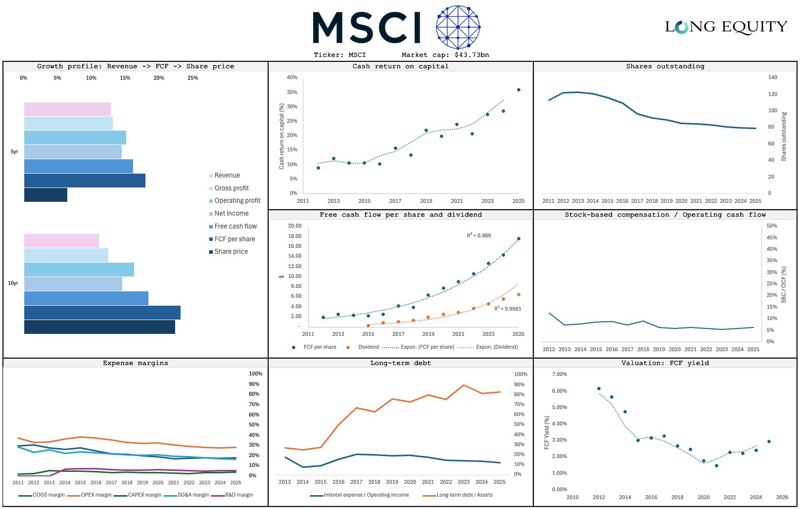 MSCI often sees its share price grow at a slower rate than its FCF. Consequently, FCF yield has been steadily going up over the last few years.