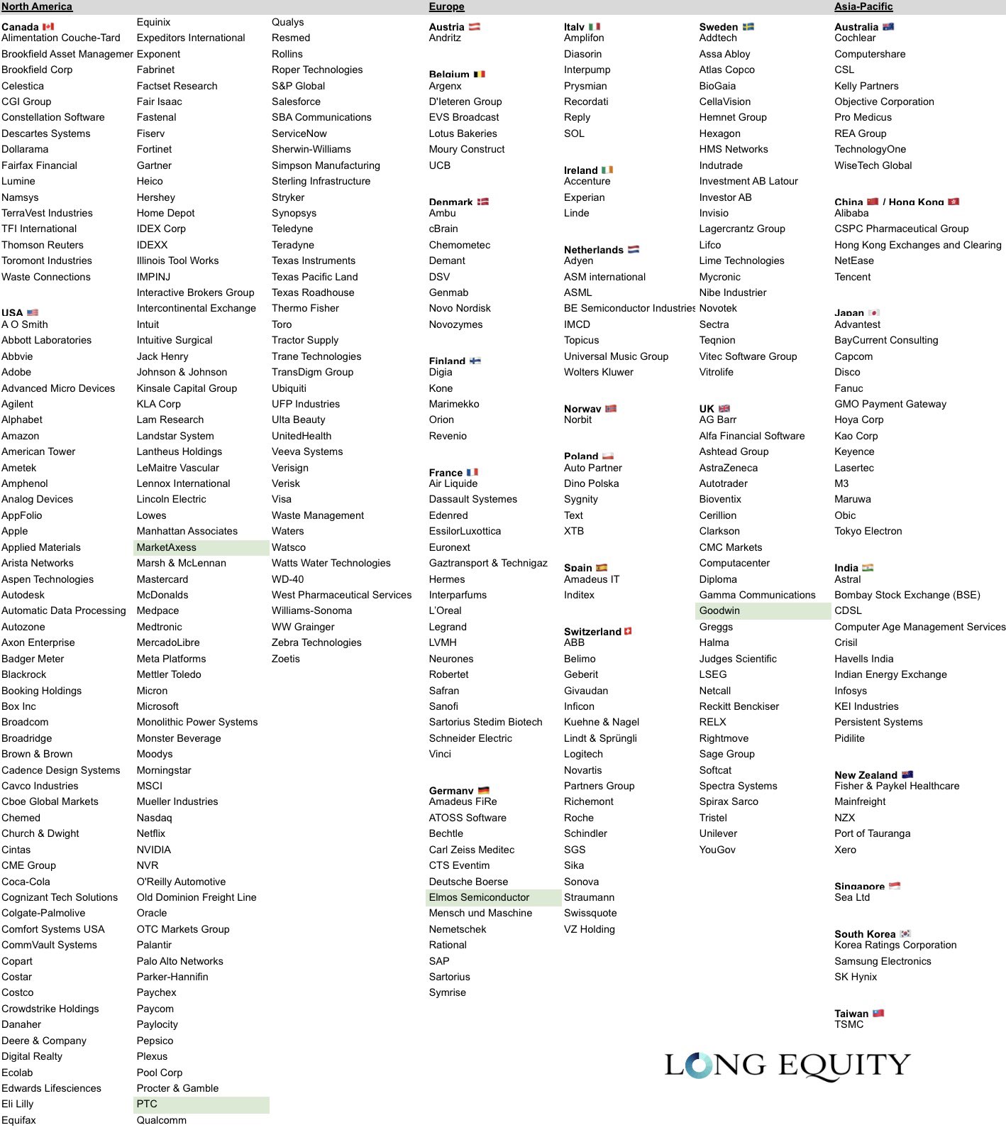 $MarketAxess(MKTX)$ , $PTC Inc(PTC)$ , $GOODWIN PLC(GDWN.UK)$ and $Elmos Semiconductor AG(ELTTF)$ .