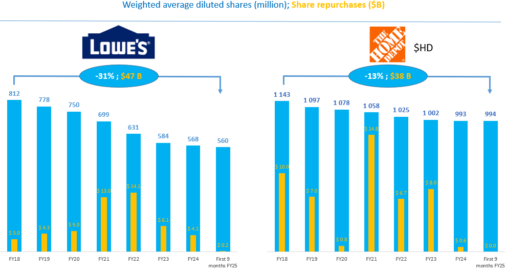 PS: $Home Depot(HD)$ $Lowe's(LOW)$ after years of buybacks they´ve both put these on hold due to acquisitions and debt level