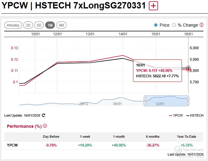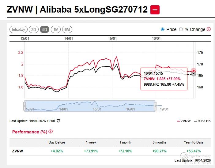 Top movers over the same period included $BABA-W(09988)$ which rose over 13%, while $POP MART(09992)$ fell around 9%. On the DLCs, the Alibaba 5x Long DLC gained around 73% while the Alibaba 5x Short DLC declined by around 54%; Pop Mart 5x Short DLC gained around 53% while the Pop Mart 5x Long DLC declined by around 43%