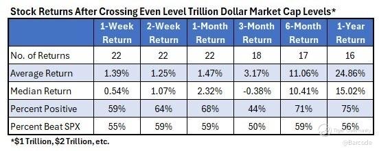 The longer-term data is far cleaner. One year after crossing an even trillion threshold, the average return is +24.86%. Outcomes are positive 75% of the time, and more than half of those returns beat the S&P 500 Index $SPX. The message is simple, milestones introduce noise, not structural tops.