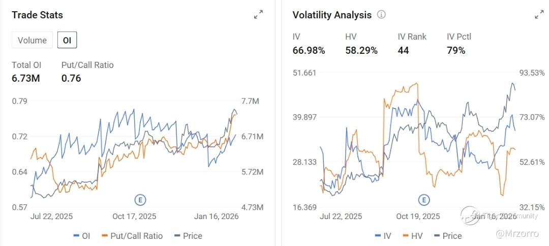 The derivatives market is actively pricing in a substantial stock reaction as Implied Volatility has surged to 66.98% to significantly eclipse the 58.29% Historical Volatility, resulting in an elevated IV Percentile of 79% that confirms market makers are demanding rich premiums to underwrite the expected fluctuation.