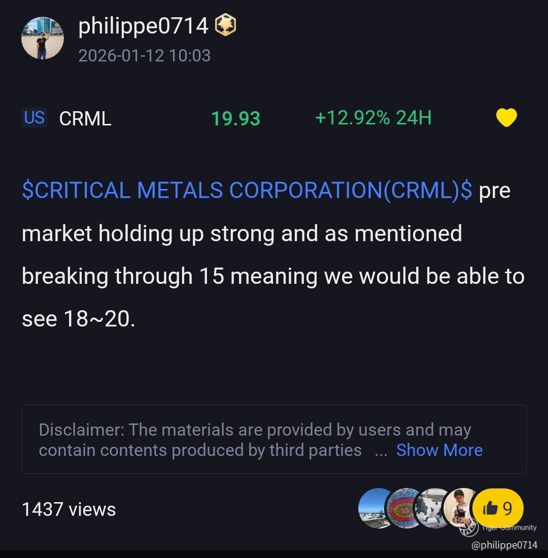 $CRITICAL METALS CORPORATION(CRML)$ on 12 Jan, i mentioned that it will hit 18~20 when it holds 15. Today is the day, 20 Jan marks the 20 on pre-market.