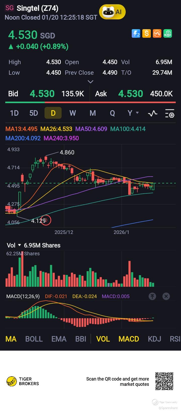 She had managed to bounce-off from 100 Days Moving Average at about 4.55 and is now trading at 4.53 ,looks rather interesting! The rebound might be attributed to SingTel being listed as top portfolio counter under the newly UOBAM Ping AN FTSE Asean Dividend index.
