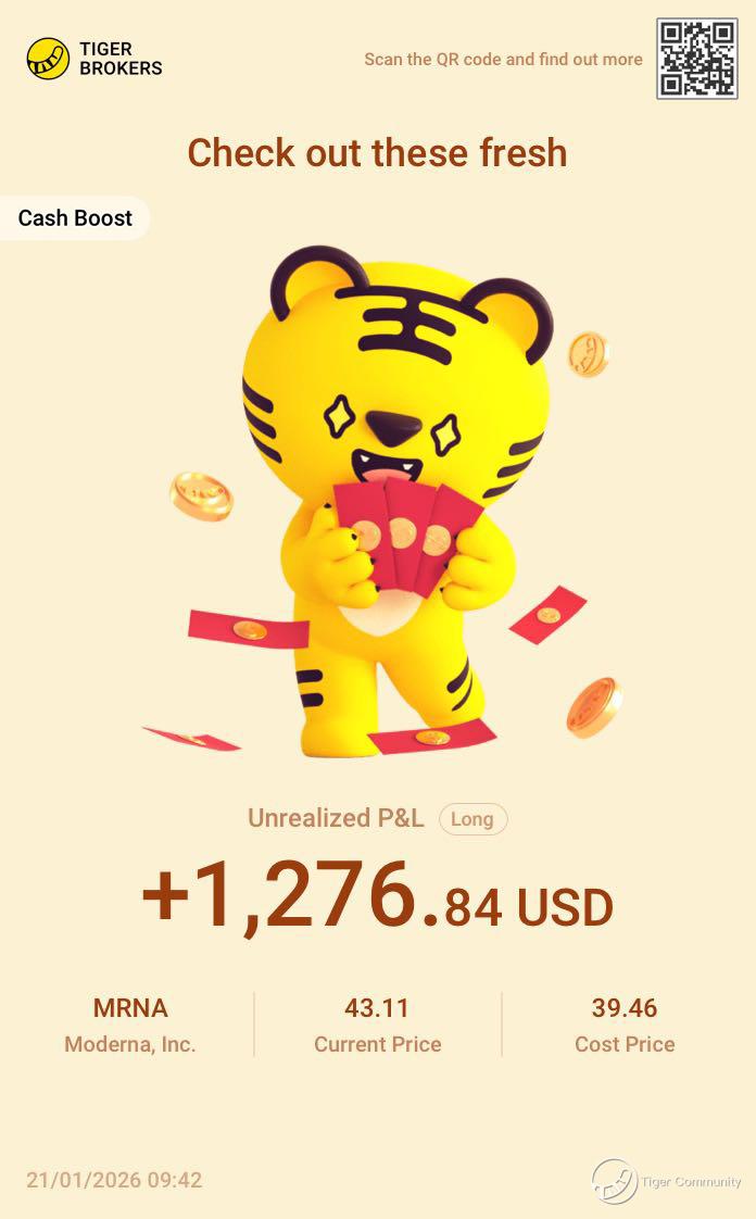 $Moderna, Inc.(MRNA)$ For MRNA, a tech powerhouse with so much cash on hand, the potential is just mind-blowing — a $100B market cap is just the beginning, and hitting $1T isn’t even out of reach. Holding this stock feels secure and exciting at the same time, profits stacking up nicely!