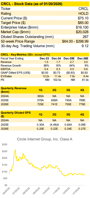 Tiger Research Team is maintaining a HOLD rating on $Circle Internet Corp.(CRCL)$ ahead of its 4Q25 earnings, but we are lowering our Price Target to $85 (previously $100).
