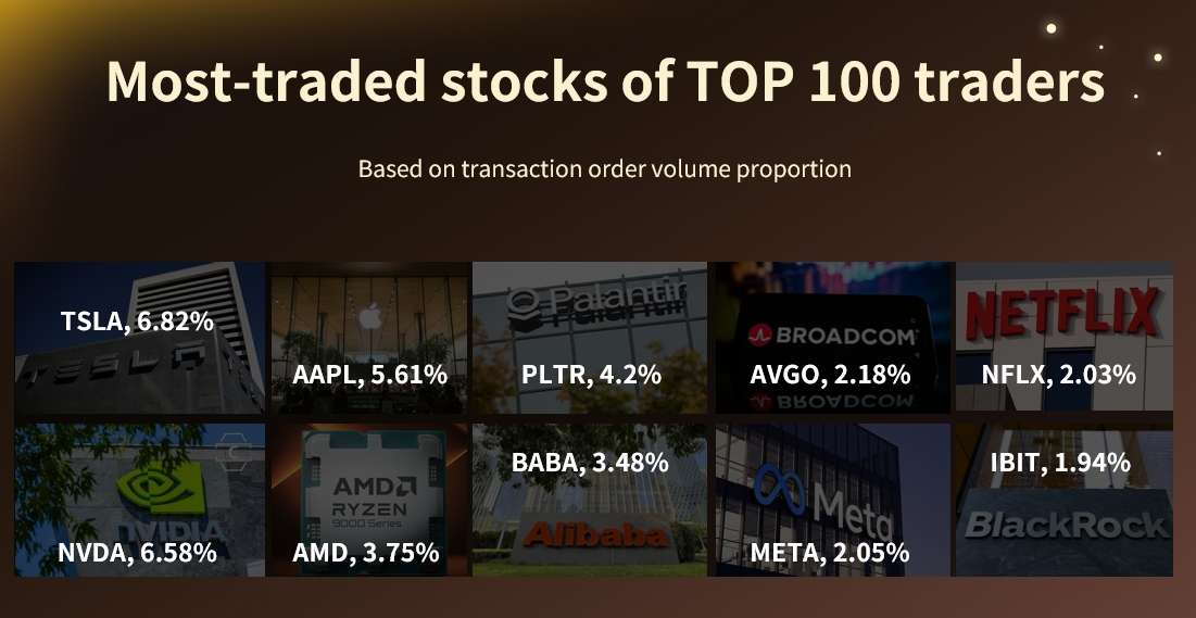 An analysis of trading patterns revealed the most popular stocks among elite performers. $Tesla Motors(TSLA)$ dominated at 6.82% of transaction volume, closely followed by $NVIDIA(NVDA)$ at 6.58% and $Apple(AAPL)$ at 5.61%. Other favorites included $Palantir Technologies Inc.(PLTR)$ , $Advanced Micro Devices(AMD)$ , $Alibaba(BABA)$ , $Meta Platforms, Inc.(META)$ , $Broadcom(AVGO)$ , $Netflix(NFLX)$ , and $iShares Bitcoin Trust(IBIT)$ .
