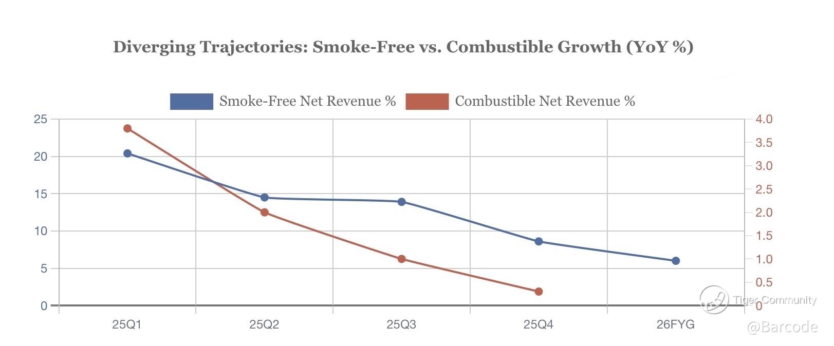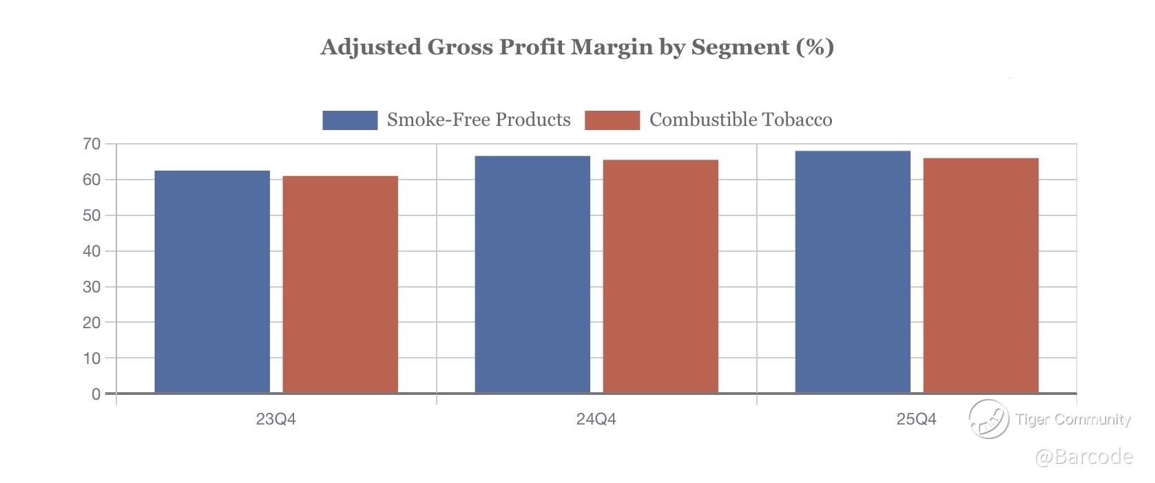 Smoke-free gross margins hit 69.5% in FY25, roughly 400 bps above combustibles, structurally lifting profitability.