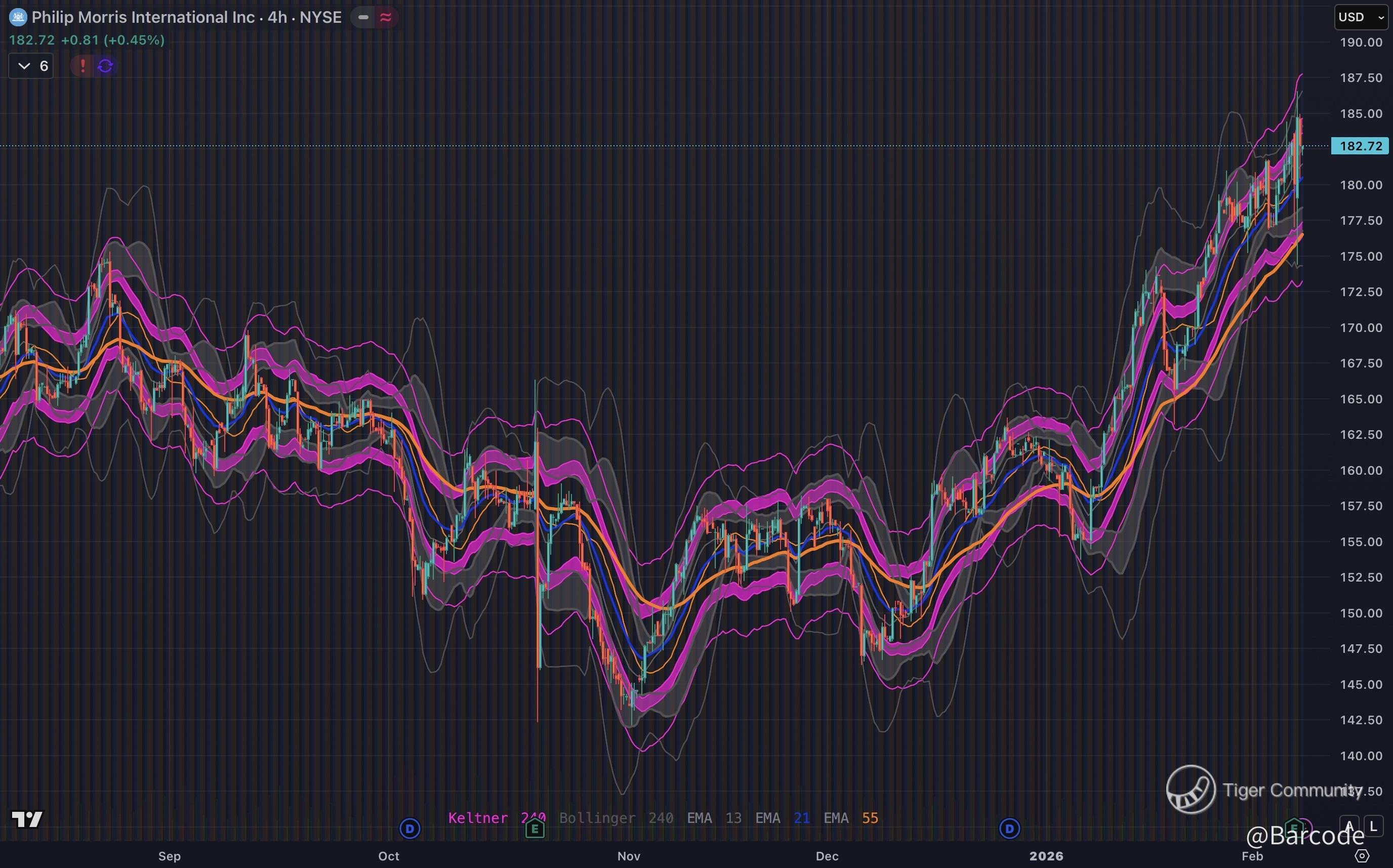 Price is now riding the upper Keltner and Bollinger envelopes, with EMA 13 and EMA 21 stacked cleanly above EMA 55, signalling strong trend alignment. Every pullback since late December has been absorbed above rising moving averages, showing institutional accumulation rather than distribution.